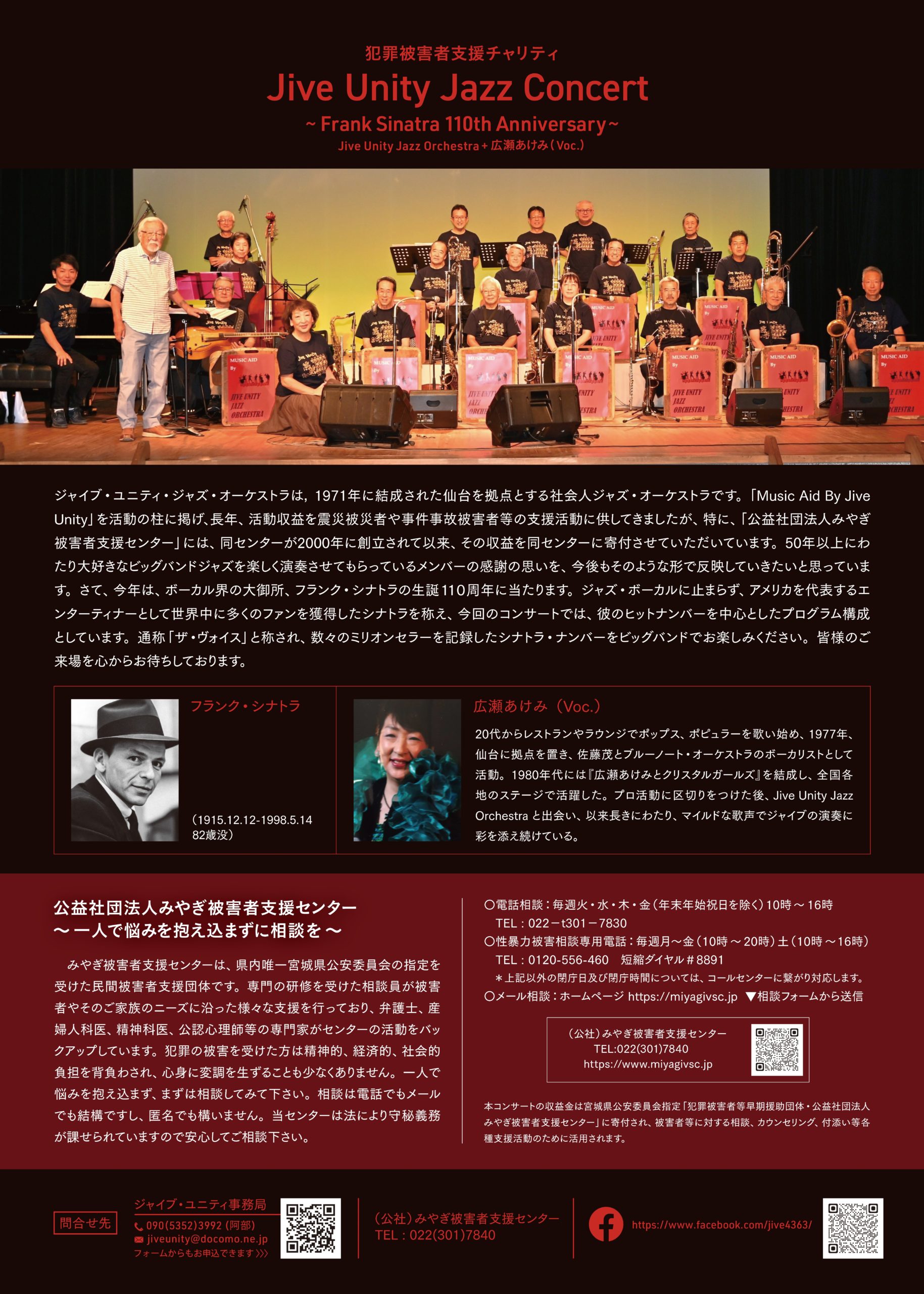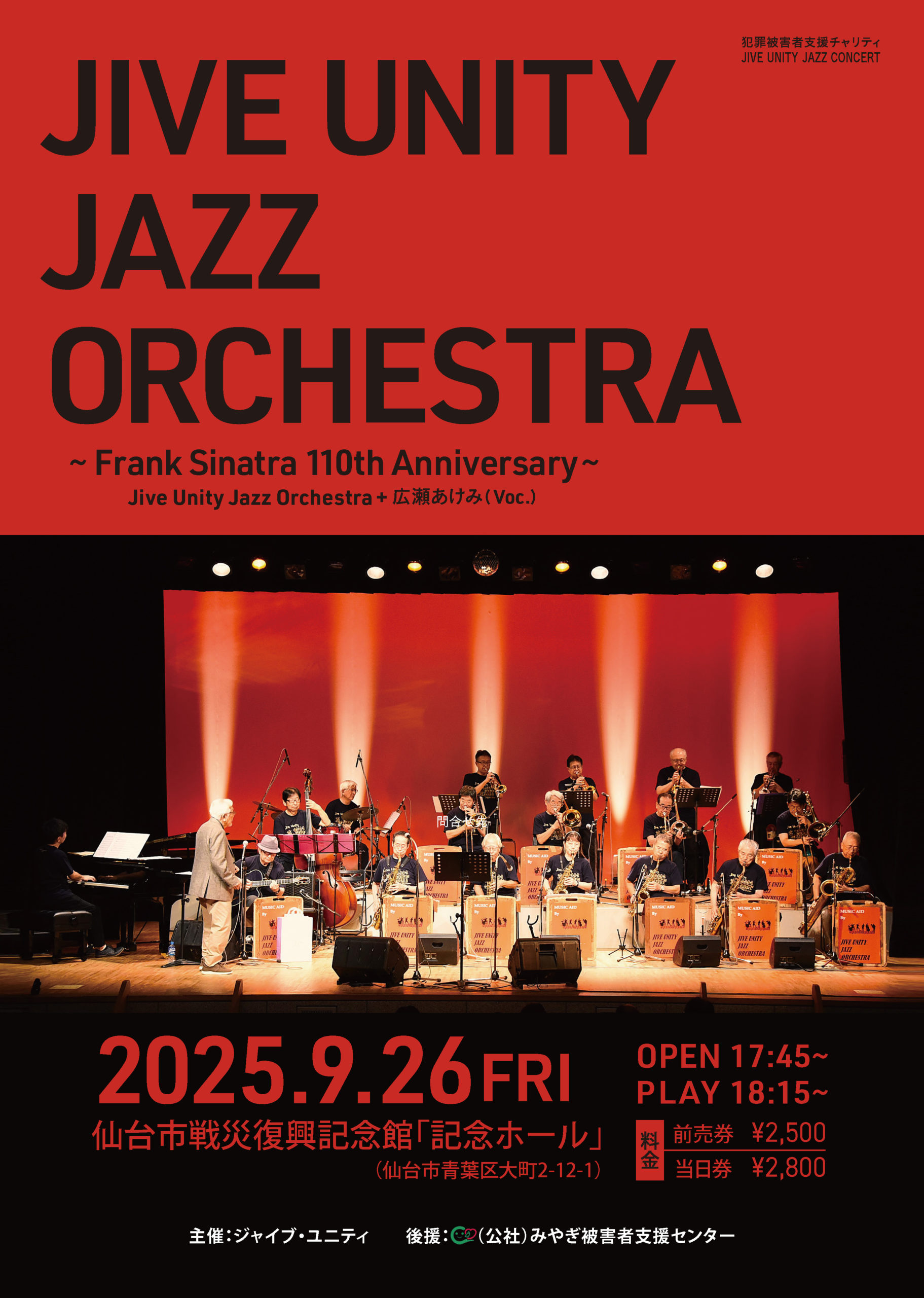 本年も「犯罪被害者支援チャリティ ジャイブ・ユニティ・ジャズ・コンサート」が開催されます。同コンサートは、出演するジャイブ・ユニティ・ジャズ・オーケストラ様が主催し、当センターが後援しています。同オーケストラ様は、1971年に結成された仙台を拠点として活動されている社会人ジャズ・オーケストラで、当センターが創立された平成12年からコロナ禍の3年間を除いて毎年チャリティコンサートを開催し、その都度コンサート収益金の一部を当センターに寄附されています。開催内容は下記のとおりですので、多くの皆様のご来場をお待ちしております。